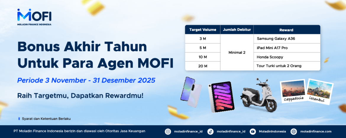 - MOFI berhak untuk membatalkan pemberian dan/atau menarik kembali program dengan atau tanpa pemberitahuan kepada dan/atau persetujuan dari Peserta sebelumnya apabila: (i) terdapat indikasi bahwa Peserta melakukan suatu aktivitas tidak wajar, tindakan kecurangan, penipuan, pelanggaran atas syarat dan ketentuan ini dan/atau peraturan perundang-undangan yang berlaku, (ii) diketahui oleh MOFI bahwa Peserta belum dan/atau tidak memenuhi syarat untuk ikut serta dan/atau memenangkan Program ini; dan/atau (iii) sesuai dengan ketentuan dan kebijakan internal MOFI dari waktu ke waktu.
