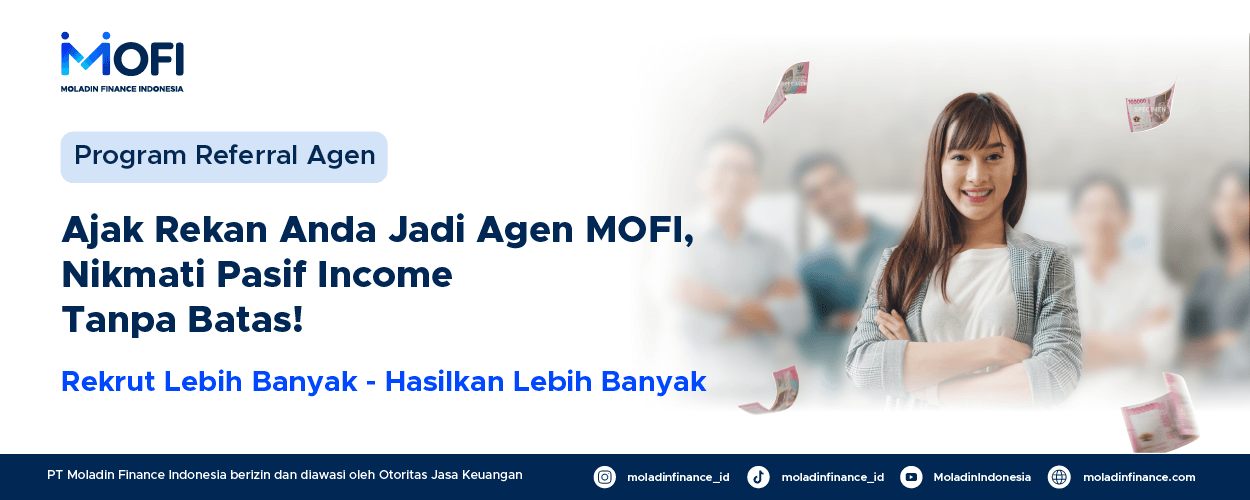 Program Referral Agen memberikan kesempatan bagi setiap agen untuk mengundang rekan Anda bergabung menjadi agen MOFI dan mendapatkan insentif dari pengajuan agen yang anda undang(kita sebut sebagai downline). Jika downline Anda berhasil memberikan aplikasi sampai dengan proses pencairan, Anda akan memperoleh insentif sampai dengan 0,125% dari pokok hutang, tergantung dari level downline anda.