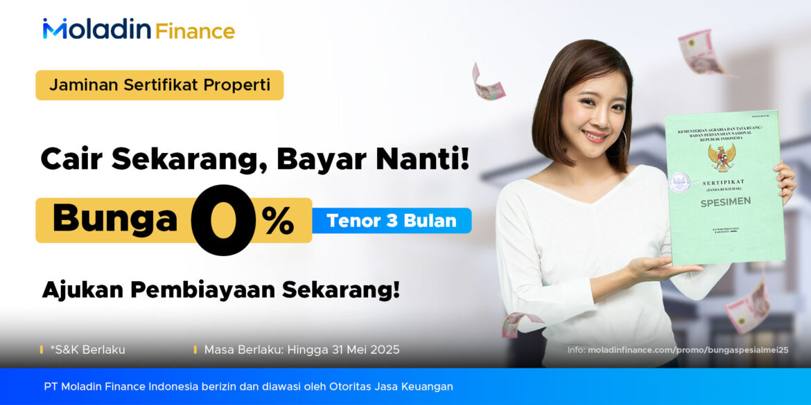 PROGRAM PROMOSI MEI 2025 PT Moladin Finance Indonesia (“MOFI”) 1. Tata Cara Program 1.1.Untuk berpartisipasi dalam Program ini, peserta (“Peserta”) wajib melakukan pengajuan pembiayaan kepada MOFI dengan mengisi formulir pada yang dilakukan melalui website https://moladinfinance.com/form (“Form”). 1.2. Peserta hanya akan berhak untuk mendapatkan Hadiah (sebagaimana didefinisikan di bawah) apabila: (a) pengajuan pembiayaannya telah disetujui oleh MOFI dan telah menerima pencairan atas pengajuan pembiayaan tersebut sesuai dengan ketentuan yang berlaku pada MOFI (“Transaksi”); dan (b) Peserta telah memenuhi syarat dan ketentuan Program ini.