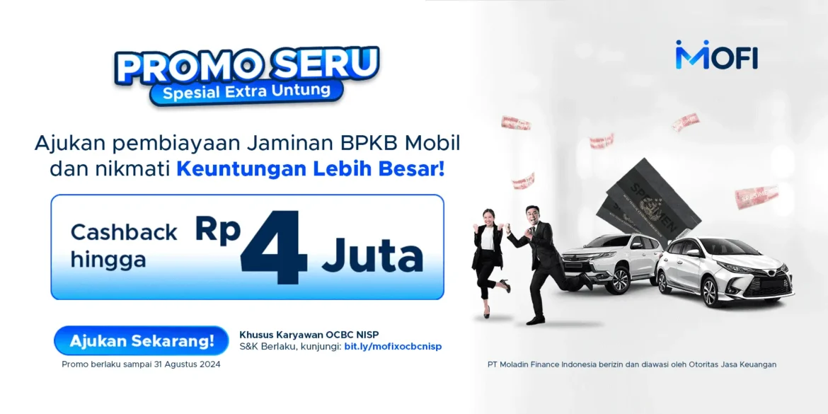 Syarat Manfaat Pembiayaan Transaksi sebesar < Rp. 100.000.000 Mendapatkan cashback sebesar Rp. 500.000 (Cashback diberikan setelah cicilan pertama, tanpa ada keterlambatan bayar lewat dari 7 hari) hanya berlaku untuk registrasi via mofi.id menggunakan link bit.ly/mofixocbcnisp Transaksi sebesar > Rp100.000.000 Cashback mulai dari Rp 4.000.000 (Cashback diberikan setelah cicilan pertama, tanpa ada keterlambatan bayar lewat dari 7 hari), hanya berlaku untuk registrasi via mofi.id menggunakan link bit.ly/mofixocbcnisp - Apabila Peserta berhak untuk mendapatkan Manfaat Pembiayaan berupa suku bunga ringan dan/atau potongan biaya admin, maka MOFI akan memberikan kedua Manfaat Pembiayaan tersebut secara otomatis pada Transaksi melalui sistem MOFI.
