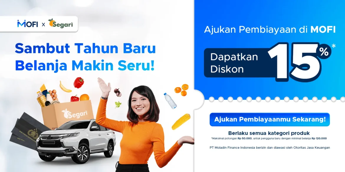 - Ajukan Pembiayaan di MOFI melalui mofi.id dan dapatkan Voucher Diskon 15% dengan Maksimal Diskon Rp 50.000 dan Minimal Transaksi Rp 120.000